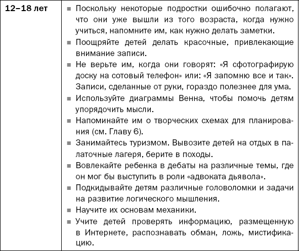 Обучение детей тому, как правильно записывать и организовывать информацию, которую требуется выучить, представляет собой эффективное средство улучшения памяти. Скучный конспект с заметками – последнее, что нужно ребенку. Поэтому предложите детям делать записи цветными ручками, использовать элементы, привлекающие внимание. Пусть пишут некоторые слова прописными буквами, чтобы они ВЫДЕЛЯЛИСЬ на фоне других. На уроках многие дети стараются записывать все подряд. Научите их пользоваться символами и сокращениями.