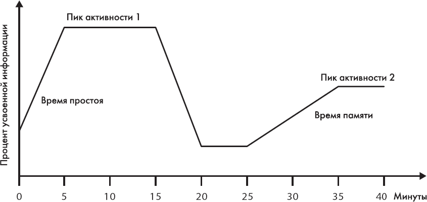 Исследования, проведенные мною во многих школах, показывают, что взгляд детей начинает уходить в сторону, а память начинает буксовать через 20 минут после начала урока. По этой причине учителя часто разделяют длинные уроки на периоды по 20 минут каждый.
