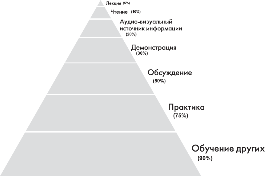 Чем сильнее увлечены дети какой-либо деятельностью, тем выше вероятность, что они больше запомнят из того, что делали. Если вы посмотрите на пирамиду памяти, приведенную ниже, вы можете увидеть, что я имею в виду. К завтрашнему дню вы будете помнить только 10 % из того, что прочитали в этой книге. Однако если вы поговорите о прочитанном с кем-нибудь, процент запоминания повысится до 50, а если решите применить полученные сведения на практике и помочь своему ребенку, то в памяти отложится уже 90 % информации.