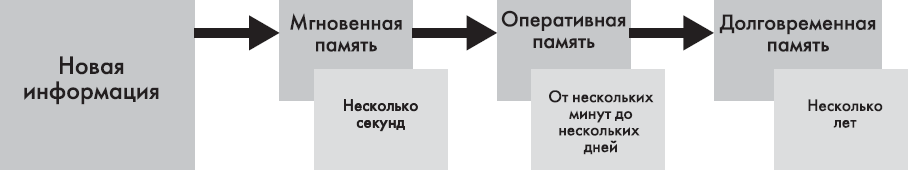 Всего существует три основных вида памяти: мгновенная, кратковременная (оперативная) и долговременная.