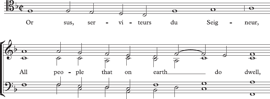 Мотив, путешествующий во времени: a) Одна из множества мелодий, опубликованных французским автором гимнов Луи Буржуа в середине XVI века, b) в 1635 году мелодия стала тенором в четырехголосной обработке в Шотландской псалтири, со словами английского метрического псалма