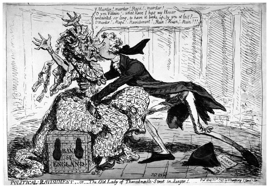 Карикатура Джеймса Гилрея, высмеивающая финансовую политику правительства, из-за которой Банк Англии получил прозвище «Старая леди»