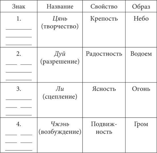 Уже в древнейших комментариях к «Книге Перемен» указывается, что первоначально было создано восемь символов из трех черт, так называемые триграммы. Они получили определенные названия и были прикреплены к определенным кругам понятий. Здесь мы указываем их начертания и их основные названия, свойства и образы.