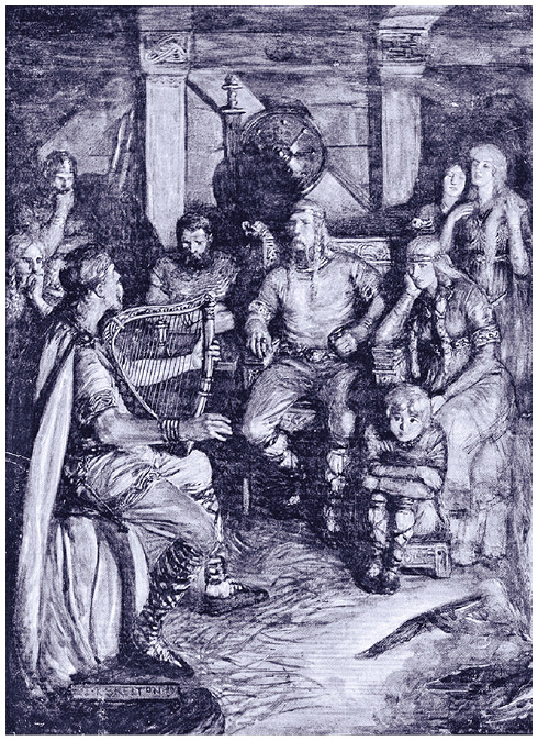 Главным носителем и создателем поэтической традиции был дружинный певец – скоп. В «Беовульфе» скоп, дружинник Хродгара, на пиру поет, аккомпанируя себе на лире, о создании Господом-Вседержителем поднебесного мира (с. 89–98); возвращаясь после победы Беовульфа над матерью Гренделя, он, скача на коне, воспевает подвиг героя и сравнивает его с прославленным змееборцем Сигмундом (с. 884–897). Репертуар скопа был крайне разнообразен: от христианских гимнов и библейских парафраз до германских героических песней и песней о современных событиях. Яркую картину познаний скопа, переезжающего от одного правителя к другому, рисует англосаксонская поэма «Видсид» («Многостранствующий»); он перечисляет десятки имен, известных из германского героического эпоса, в том числе героев «Беовульфа»: