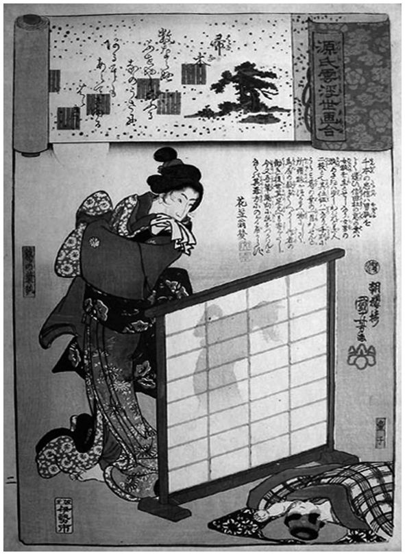 Утагава Куниёси. Тень. 1880-е гг. Женщина-кицунэ отбрасывает на ширму тень в виде лисы