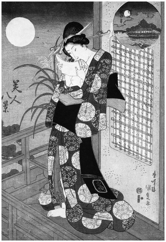 Утагава Кунисада. Женщина на веранде при свете луны. 1830-е гг.