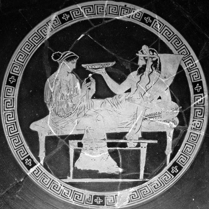 Афина угощает Геракла. Рисунок на древнегреческой вазе. V в. до н. э.