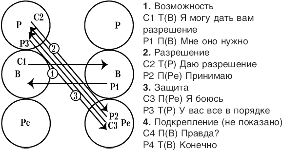 Рис. 18 показывает три ступени отдачи эффективного разрешения. Первый вектор, ВВ, показывает закрепление Взрослого. Второй вектор, РРе, есть само разрешение. Третий вектор, РРе, представляет терапевта, дающего Ребенку пациента защиту от пробудившегося Родителя.