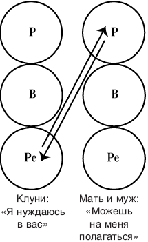 Кью: Диаграмма показывает отношения между вашим Ребенком и Родителем вашего мужа. Так было и в вашем детстве. Родитель вашей матери хотел, чтобы вы зависели от нее, а ваш Ребенок соглашался с этим. Так что, как видите, в этой части брака муж занял место вашей матери.