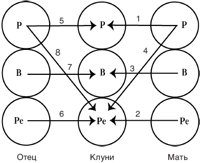 Кью: Сейчас мы начертим на диаграмме стрелу, где Ребенок вашей матери побуждает действовать вашего ребенка (рис. 19Б). Тогда ее Ребенок радуется и улыбается, а потом выходит ее Родитель со своим «Разве это не ужасно?». Но по-прежнему чего-то не хватает, потому что где-то должен появиться ваш отец.