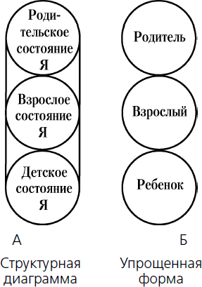 Здесь целесообразно привести рис. 1(А), который называется структурной диаграммой. На ней представлены с современной точки зрения все составляющие личности любого индивидуума. Она включает Я-Родителя, Я-Взрослого и Я-Ребенка, которые четко отделены друг от друга, поскольку сильно различаются и порой совершенно несовместимы. Неопытному наблюдателю различия могут показаться несущественными. Однако стоит преодолеть трудности изучения структурного анализа, как все это станет значительным и интересным. Впредь мы договоримся называть реальных людей родителями, взрослыми и детьми (со строчной буквы); слова Родитель, Взрослый и Ребенок с прописной буквы означают состояния Я. На рис. 1 (Б) представлена упрощенная и более удобная структурная диаграмма.