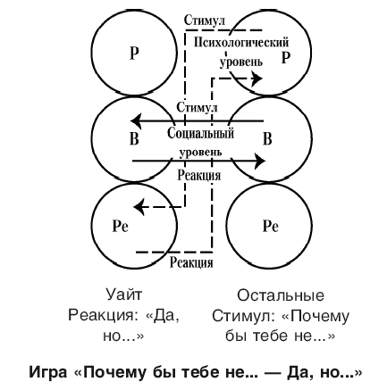 Это показано на рис. 8. Игра может продолжаться, поскольку на социальном уровне и стимул, и реакция происходят от Взрослого к Взрослому, на психологическом уровне они также дополняющи: стимул направлен от Родителя к Ребенку («Почему бы тебе не…»), а ответ – от Ребенка к Родителю («Да, но…»). Психологический уровень обычно обеими сторонами не осознается, но перемена состояний Я (Уайт меняет Взрослого на неприспособленного Ребенка, остальные – Взрослых на мудрых Родителей) может быть подмечена внимательным наблюдателем по изменениям позы, мышечного напряжения, тона голоса и словаря.