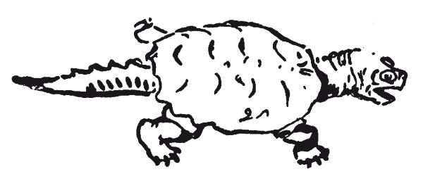 [Закрыть] Каймановая черепаха по праву слывет самой хищной из черепах и, соотносимо с ее размерами, самой сильной. Ее беззубые челюсти имеют режущие края и образуют могучий клюв, способный дробить кости. Щиты на спине и брюхе делают ее практически неуязвимой для хищных птиц и зверей. Босикадо лежал, точно обломок бревна, вытянув длинный крокодиловый хвост, но злобные глазки в змеиной голове внимательно следили за берегом. Панцирь, широкий и старый, оброс бахромой зеленых водорослей, а незащищенные чешуйчатые подмышки были все в гроздьях пиявок, которых с жадностью склевывала пара чибисов, чем чудовище, видимо, было очень довольно. Толстые лапы и когти выглядели достаточно устрашающе, однако свирепые красные глазки производили куда более жуткое впечатление.