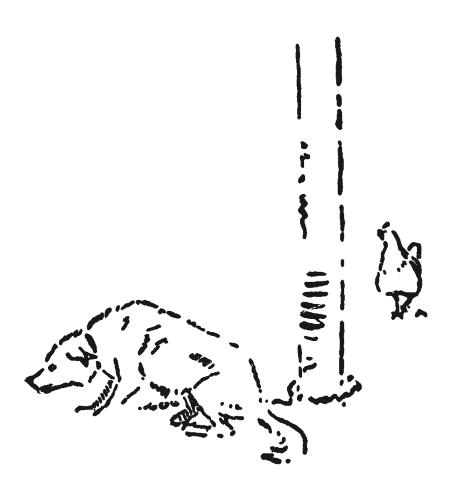 Налеты на курятник не входят в обычаи енотова племени. Следовательно, их посетил енот с извращенным вкусом, и можно было ожидать продолжения. Куонеб решил, что зверь явится в следующую ночь, и приготовил ловушку. Он привязал к щеколде веревку, перекинул ее через сук ближайшего дерева и снабдил противовесом. Теперь дверь захлопывалась сама. А чтобы она заодно и запиралась, он подпер ее изнутри шестом. Затем, чтобы дверь не закрывалась до времени, он изготовил упор из плашки с таким расчетом, что енот, входя, должен был наступить на упор, сбить его и высвободить дверь.