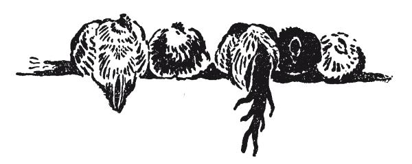 Угол сарая был отгорожен под курятник, где полтора десятка кур исправно исполняли свои обязанности. В первую ночь водворения в сарай «медно-красных ангелов» хохлатки уже сладко спали на насестах. Внезапно новых работников разбудило отчаянное кудахтанье, которое тут же оборвалось, словно курице привиделся какой-то куриный кошмар и она свалилась наземь, но тут же взлетела на свое место и снова уснула. Однако утром в уголке сарая они увидели полусъеденный труп производительницы свежих яиц. Куонеб осмотрел безголовое тело, следы в пыли и буркнул:
