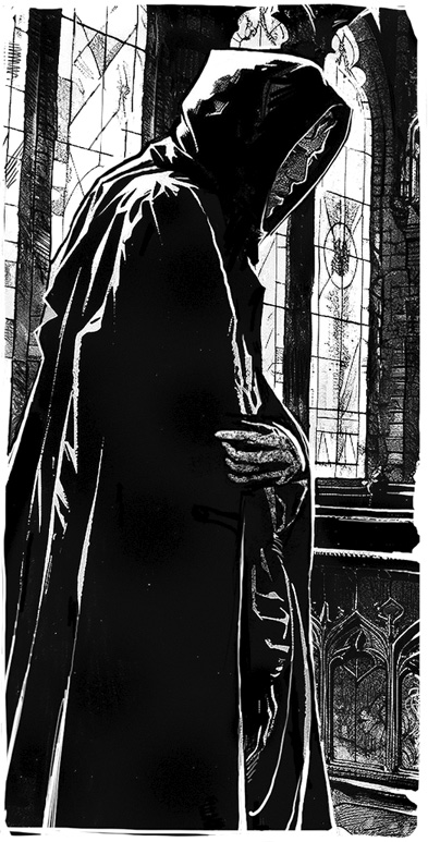 Я свернул на узенькую тропинку, извивавшуюся по крутому склону, и, выйдя из кустов, увидел в глубине долины прекрасный величественный замок… Так вот оно, место загадочной затеи графа, навстречу которой так отважно шел теперь я! Вскоре я очутился в парке, окружавшем замок; по его сумрачной боковой аллее гуляли двое мужчин, один из них был в одеянии послушника. Приблизившись ко мне, они прошли мимо, за разговором не заметив меня. Послушник был юноша, на его красивом мертвенно-бледном лице лежала печать точившей его скорби; второй, просто, но прилично одетый, казался уже человеком пожилым. Они уселись спиной ко мне на каменную скамью, и до меня явственно доносилось каждое произносимое ими слово.