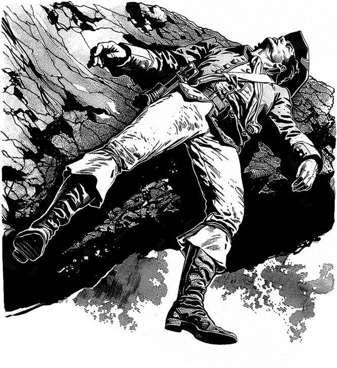 А на самом краю обрыва, на выступе нависшей над бездной скалы, сидел молодой человек в офицерской форме; возле него лежали шляпа с высоким султаном, шпага и бумажник. Казалось, он спал, свесившись над пропастью и сползая все ниже и ниже.