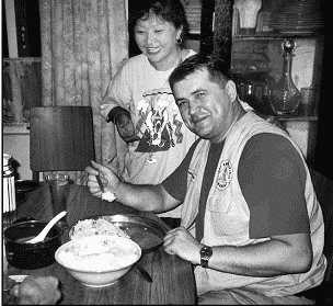 Несколько дней мы потратили на скучные хождения в китайское посольство в Непале за визами на Тибет. Но ответа из Пекина все не было. Миссис Персис – президент туристической фирмы, организовавшей нашу поездку на Тибет, чтобы развеять тревоги пригласила нас к себе домой на ужин. Она по непальским масштабам была состоятельным человеком. Случайно заглянув на кухню, я заметил там солидного размера тазик. Помня, что Селиверстов обладает завидным аппетитом, (он съедает по 100 пельменей за раз), я предложил наложить ему полный тазик риса, обещая, что мой друг справится с поставленной задачей. Всех домочадцев, особенно детей, это привело в дикий восторг.