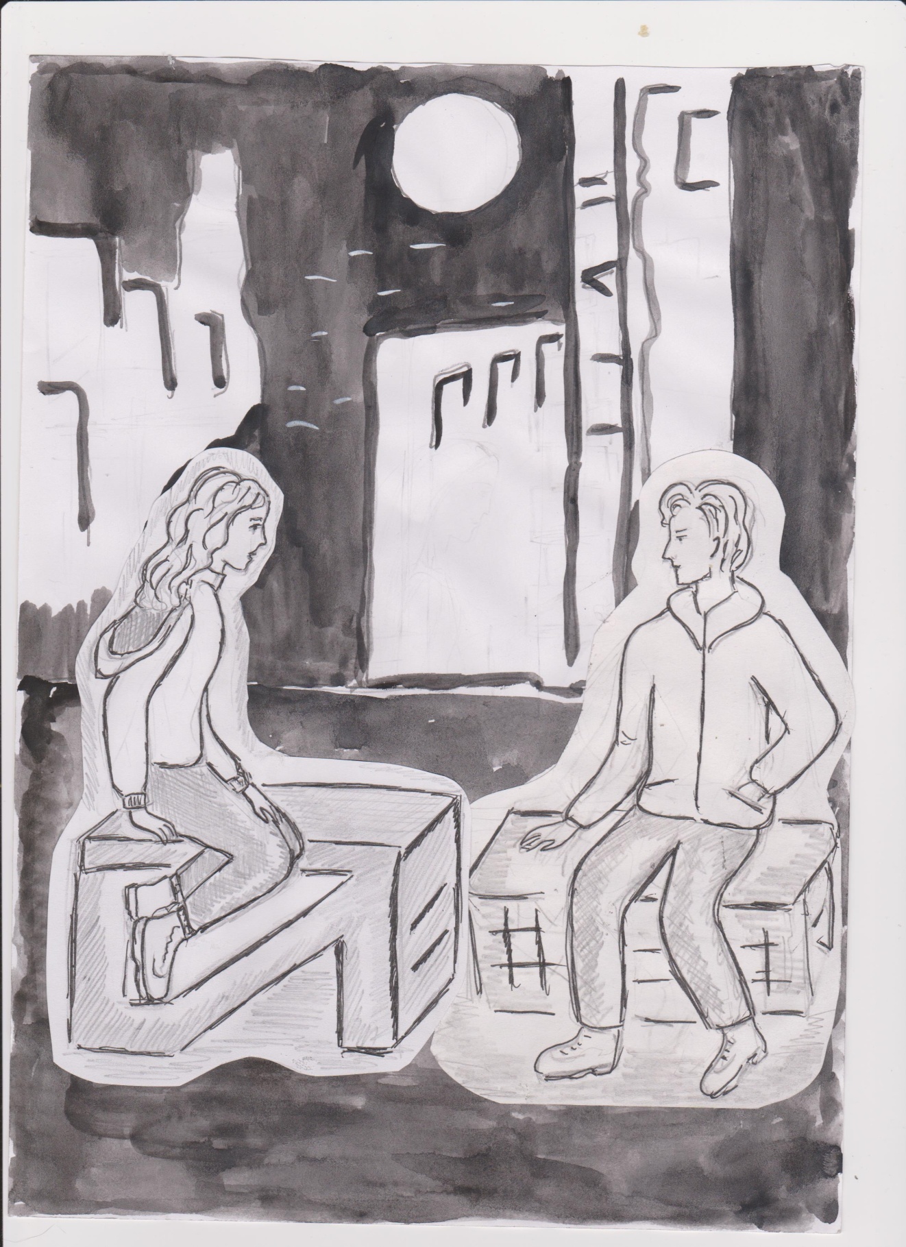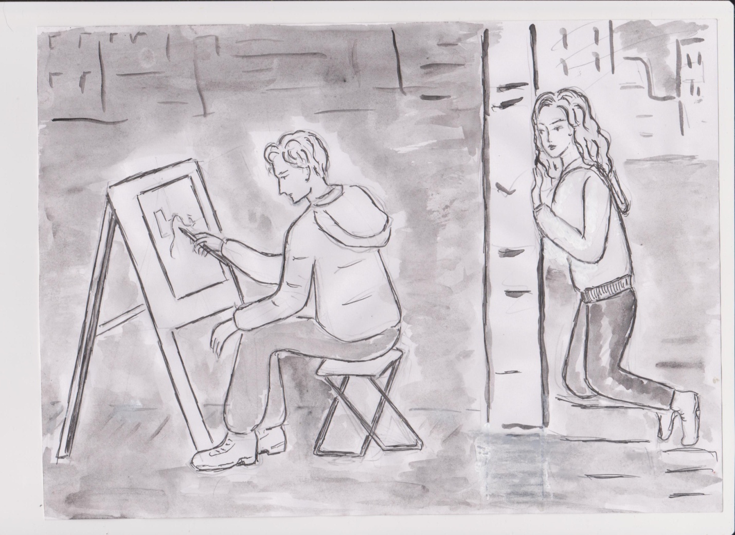 Окна моего обиталища были местами треснуты, в щели проникал сквозняк с улицы. Я почувствовала запах человека и услышала сердцебиение, оно было спокойным и ровным, примерно метрах в двухстах от моего пристанища. Я насторожилась, начала прислушиваться. На улице уже совсем стемнело, а это значит, что можно начать охоту. Не хотелось бы мне упустить свою добычу. Я была достаточно голодна, с моей последней охоты прошло дня четыре. С ловкостью пантеры я спустилась по бетонной конструкции, выбравшись в брешь бетонной стены, непонятно как она ещё до сих пор не рухнула. Бесшумно, как хищник, который крадется к своей добыче, я приблизилась на пятьдесят метров к теплокровному объекту. Он сидел ко мне спиной, и мне был слышен скрип карандаша о бумагу. Это странно, обычно наблюдая за забредшими сюда мужчинами, я слышу хохот и пьяную брань. А кому ещё взбредет в такое время бродить по моим владениям? Я подождала ещё минут пять, рядом никого другого не было. Шуршание карандаша не прекращалось, было достаточно темно, человек подсвечивал картину фонариком от телефона. Я всё ближе подкрадывалась. Мужчина в темно-синей куртке сидел на каком-то деревянном обломанном ящике, напевал, что-то себе под нос и рисовал. Перед ним стоял мольберт, я могла разглядеть, что он рисует. Он рисовал этот удручающий пейзаж, эти руины моего обитания, руки его были испачканы грифелем карандаша, его черные спортивные штаны были в пыли. «Зачем? Зачем он рисует это место? Неужели он видит какую-либо прелесть в этом месте? Нельзя было поехать куда-то на море и нарисовать что-то более лицеприятное?» – смеялась я про себя… «Почему он, как и остальные не пьёт что-то согревающее и не хохочет в пьяном угаре? Это или чудак или сумасшедший». Мне стало интересно, хотелось рассмотреть картину и самого художника лучше, я подкралась ещё ближе, между нами оставалось уже метров пять-семь не больше. У него были густые, темные, слегка волнистые волосы. Пар шел у него изо рта, периодически он грел пальцы, поднося их ко рту. Видимо, он замерз. В какой-то момент он начал подниматься со своего места, видимо, собрался уходить. Меня заинтересовала его картина, но не все было видно, большую часть скрывала его спина. «Что же там? Как он видит всю эту разруху?» На миг я даже забыла, что веду охоту, и моя увлеченность его творчеством несколько отвлекла меня. Я наступила на толстую металлическую арматуру, она была изогнутой, развернувшись, она со стуком ударила по бетонному обломку. Парень вздрогнул, обернулся и увидел меня…