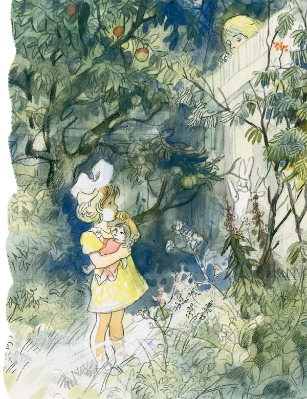 Восхищенная таким необъяснимым чудом, равного которому, конечно, и нет на свете, девочка выронила куклу, подошла к забору, и добрый заяц послушно опустился ей прямо в руки. А вслед за зайцем выглянуло лукавое и довольное лицо Жени.