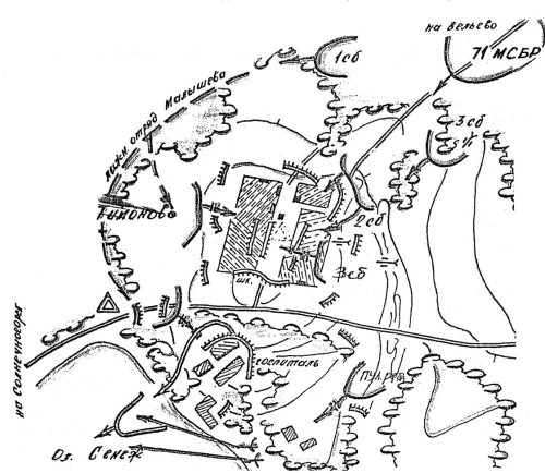 5 февраля на этот участок фронта прибыла 154-я морская стрелковая бригада. Ее части, совершив 250-километровый марш по лесам, с ходу вступили в бой.29 Упорное сопротивление бригаде противник оказал под Верхней Сосновкой. В бою были тяжело ранены командиры взводов В. Петров, С. Кирсанов и командир роты Носыров. Атакующие подразделения под сильным огнем противника залегли. В этой сложной обстановке командование принял политрук роты С. Н. Васильев. Он поднял роту в атаку и, идя впереди атакующих, получил два ранения, но не оставил поле боя. Морские пехотинцы штурмом взяли Верхнюю Сосновку. На поле боя противник оставил убитыми около 100 чел. Во время боя на окраине Верхней Сосновки мичман С. Н. Васильев был смертельно ранен.