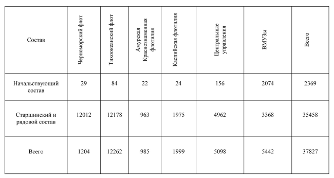 Следует отметить, что моряки составляли от 30 до 80 процентов численности личного состава бригад. Остальная часть приходилась на призванных из запаса и фронтовиков, выписавшихся из тыловых госпиталей. Санитарные подразделения укомплектовывались преимущественно женщинами. На должности старшего командного состава бригад (командиров и военкомов, командиров батальонов и дивизионов, начальников штабов) назначались офицеры ВМФ и сухопутных войск соответствующих категорий. Первоначально почти все должности командиров и военкомов бригад занимали морские офицеры корабельного состава и береговой обороны. На должности командиров взводов, рот, батарей и их заместителей, начальников штабов батальонов, дивизионов и их помощников были назначены выпускники военно-морских училищ.8 Для укомплектования бригад командирами отделений, помкомвзводами и старшинами рот военно-морские учебные заведения и флоты выделили часть своего младшего командного состава и курсантов морские пехотинцы.