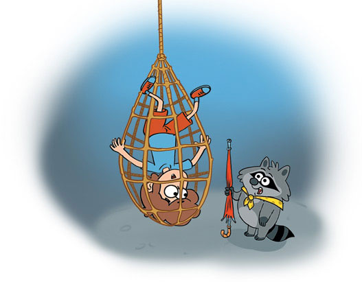 Только теперь Кефир и Рикошет сообразили, что перед ними раскачивается прочный сетчатый мешок, в котором вниз головой висит темноволосый чумазый мальчик лет семи. Ловушка Гавроша сработала на славу. Мальчик Егор с любопытством разглядывал енотов и, похоже, нисколько их не боялся.