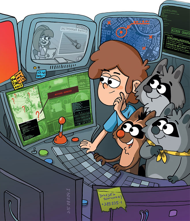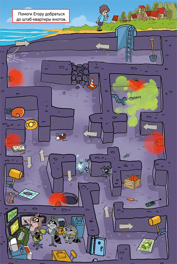 Штаб-квартира енотов располагалась в глубокой пещере, добраться до которой можно было только по длинному и извилистому подземному коридору. Вход в него, скрытый густыми кустами, находился неподалёку от озера в центре городского парка. Полы пещеры устилали мягкие коврики, на потолке висела красивая люстра, на стене – большой телевизор, перед которым стояли два мягких кресла и диван.