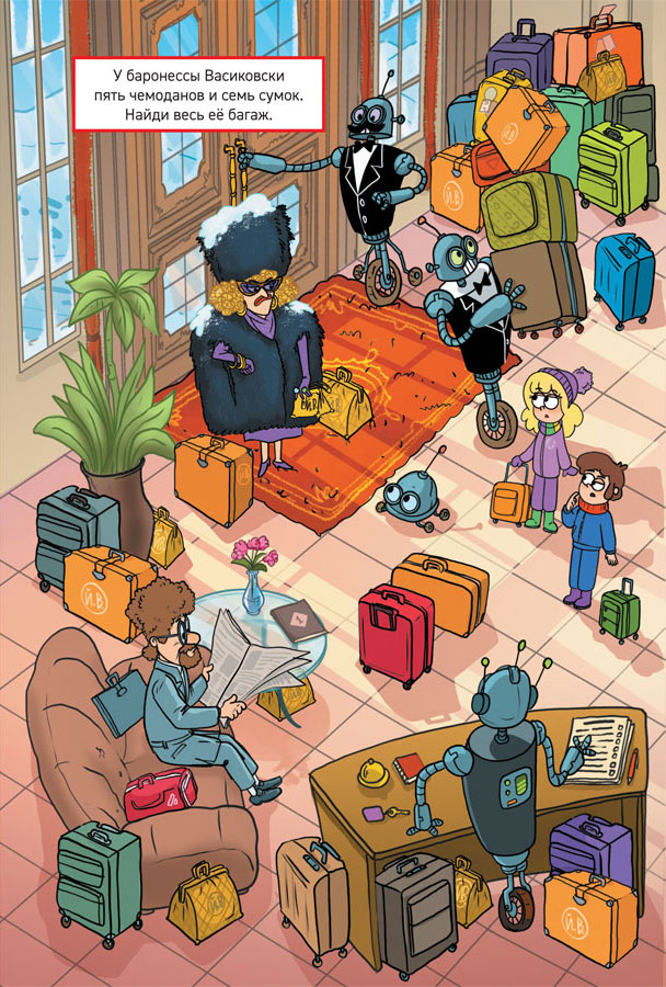 Один из роботов схватил чемодан Гарпины Дормидонтовны и повёл покачивающуюся дамочку в её номер. Потом в холл вернулся управляющий Варивода. Он подозвал свободного робота-носильщика, и тот помог бабушке Марине, Илоне и Егору донести сумки до их номера.