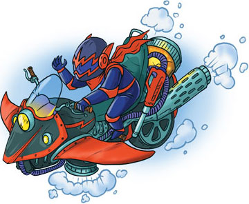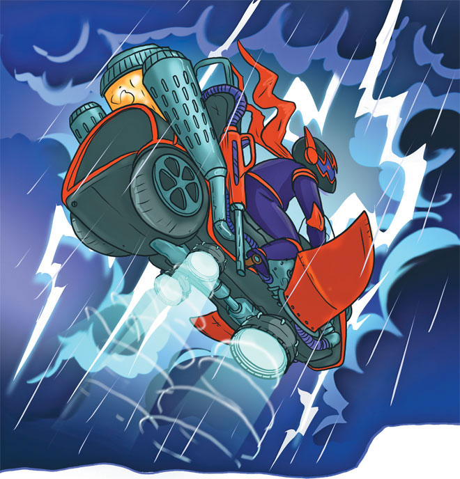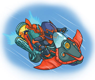 Человек нахлобучил на голову чёрный мотоциклетный шлем с тонированным стеклом, а затем с разбегу запрыгнул на очень странный летательный аппарат. Рука в чёрной перчатке крутанула гашетку на руле.