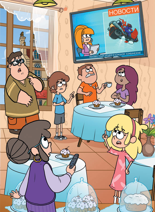 Бабушка Марина включила телевизор, висящий на стене кафе. В новостях показывали сюжет об ограблении. Неизвестный злодей в кожаном комбинезоне, сидящий верхом на большом пылесосе, был запечатлён сразу несколькими камерами слежения, и запись крутили не переставая.