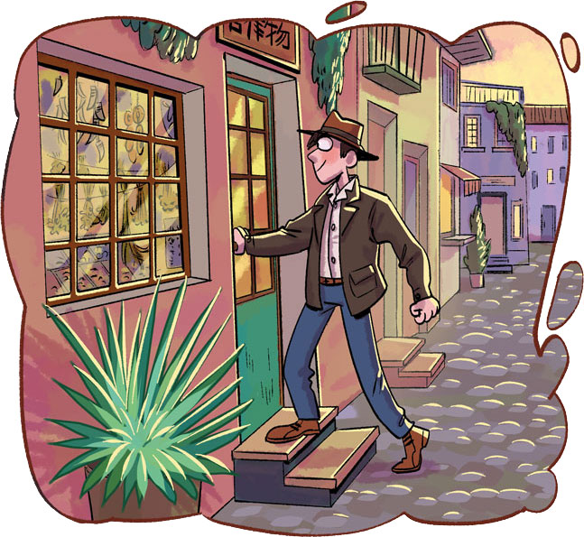Жуков весь день бродил по острову, снимая всё на камеру, и пытался найти что-то необычное, но с этим не особо везло. Вечером, когда уже начало смеркаться, Вадим отправился обратно на паром, чтобы вернуться на материк, но по пути решил заглянуть в одну из местных сувенирных лавок. Хотелось оставить себе что-нибудь на память об острове.