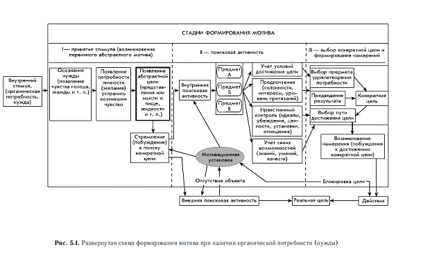 Рассмотрим этапы формирования мотива, когда стимулом является биологическая потребность личности, проявляющая себя в виде нужды, влечения (см. рис. 5.1).