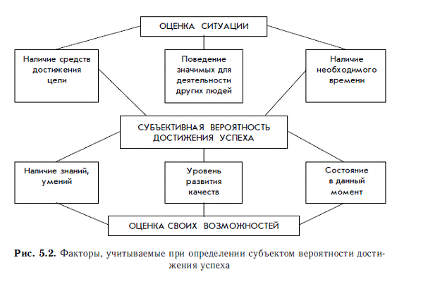 Задачей второго этапа мотивационного процесса прежде всего является определение субъективной вероятности достижения успеха при различных способах поведения и деятельности. Этот прогноз делается человеком с учетом своих возможностей и ситуации, в которой он находится (см. рис. 5.2).