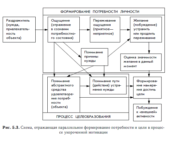 Конечно, речь не идет о том, что автоматизированные действия становятся немотивированными. Как отмечает В. А. Иванников, действие автоматизируется не только в исполнительной, но и в мотивационной части. Поэтому возникновение потребности прямо ведет (по механизму ассоциации) к появлению образа того конкретного предмета, который в данной ситуации чаще всего удовлетворяет данную потребность, и образу тех действий, которые связаны с этим предметом. В результате первый этап мотивационного процесса сразу смыкается с третьим этапом (см. рис. 5.3).