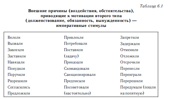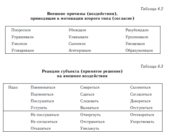Часто целью воздействий (влияний) субъекта Б (инициатора влияний) на субъекта А (адресата влияния) является такое изменение мотивов, намерений последнего, которое служило бы удовлетворению потребностей, склонностей, интересов первого. Казалось бы, цель педагога, воспитывающего ребенка, – изменить в лучшую сторону его поведение. В действительности же он делает это еще и потому, что у него есть потребность, желание заниматься воспитанием детей. О влиянии на намерения других людей с целью личной выгоды (под прикрытием благих намерений: для пользы дела, для общества, для другого человека) много говорить не приходится. Например, учитель может влиять на мотивацию поведения детей с целью удовлетворения своей потребности в ощущении власти, потребности в самоутверждении. Таким образом, при внешнеорганизованной мотивации может происходить конкурентная борьба мотиваций двух взаимодействующих в процессе общения субъектов. Поэтому психологические воздействия на субъекта А со стороны субъекта Б могут привести как к согласию, так и к отказу первого выполнить просьбу, требование и т. п. Однако это не значит, что отказ человека выполнить приказ или требование не мотивирован. При отказе формируется мотив не действия, а поступка. Поэтому и говорят о мотивах отказа, понимая под ними его причины. Рассмотрим вариант формирования мотива, обусловленный внешними второсигнальными стимулами (просьбами, приказами, требованиями, распоряжениями и т. п.). Ниже приводятся списки внешних причин – табл. 6.1 и 6.2[11]11