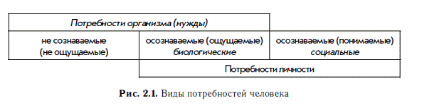Первое: не всякая нужда организма (органическая потребность, дефицит) осознается человеком и превращается в побуждение, например нужда в минеральных веществах, витаминах и т. п. Поэтому часть нужд организма (которые не отражаются в сознании) могут не переходить в потребность личности (рис. 2.1).