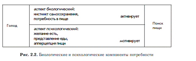 С психологической точки зрения биологическая потребность представляет отражение в сознании этих видов возбуждения: специфическое возбуждение отражается в виде ощущения возникшего отклонения от гомеостаза (например, ощущение голода), частично специфическое – в виде переживания приятного или неприятного (комфорта или дискомфорта), а неспецифическое возбуждение – в виде внутреннего напряжения и стремления (желания) усилить или устранить переживание.