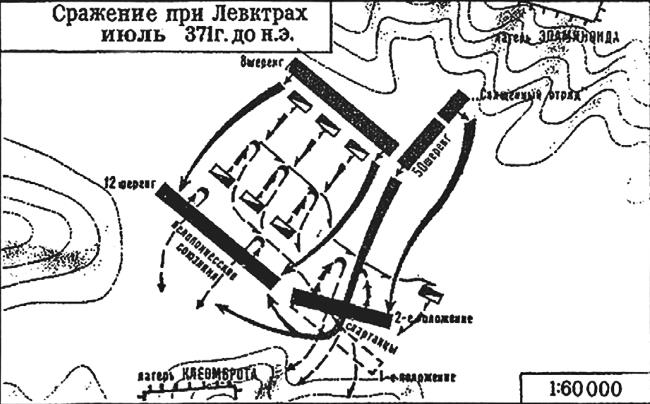 В сражении при Левктрах Эпаминонд располагал меньшими силами, чем противник, и при параллельной атаке фиванцы могли быть охвачены более многочисленной спартанской фалангой. Эпаминонд отказался от равномерного распределения сил по фронту и сосредоточил ударную колонну фиванцев («священный отряд») на направлении главного удара и так называемой косой атакой (противники сближались под острым углом) добился полной победы69. Он сформировал колонну глубиной в 50 шеренг непосредственно против спартанских воинов во главе с царём Клеомбротом. Колонна такой плотности прорвала их строй. А удар 300 отборных воинов «Священного отряда» фиванцев во главе с Пелопидом не позволил спартанцам охватить колонны Эпаминонда с флангов. В результате Клеомброт погиб, его войско было дезорганизовано и разбито, а спартанцы потеряли более 1000 человек убитыми. Данная битва положила конец 300-летнему превосходству спартанской пехоты70.