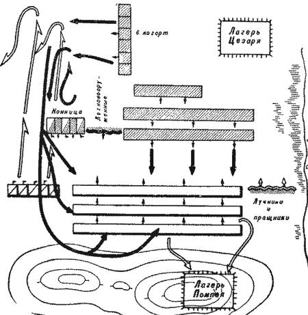 В ходе битвы при Фарсале – решающем сражении гражданской войны 49–45 годов до н. э. между войсками Гая Юлия Цезаря и Гнея Помпея, боровшихся за единоличную власть над Римом, Цезарь против превосходящей конницы Помпея поставил шесть резервных когорт позади своего десятого легиона, приказав не показываться на глаза неприятелю, пока они не подъедут на близкое расстояние, затем выбежать из рядов, но не бросать пилумы, а сражаться ими, как копьями ближнего боя, эффективными против конницы. В решающий момент боя, кавалерия Цезаря расступилась, и три тысячи солдат, стоявших в резерве, двинулись навстречу врагу. Исполняя данное им поручение, они стали бить копьями вверх и метить в лицо. Конница Помпея, неопытная в таких сражениях, оробела и не могла вынести ударов в глаза. Всадники, закрывая лицо руками, поворачивали коней и обратились в позорное бегство. Исход битвы был предрешён.