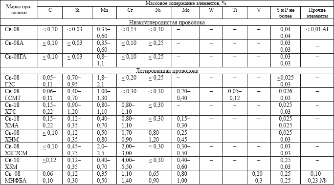 Обозначение марок проволоки составляется из сочетания букв и цифр. Первые две буквы «Св» означают – сварочная проволока. Следующие за ними первые две цифры указывают содержание углерода в сотых долях процента. Далее следуют буквенные обозначения элементов, входящих в состав проволоки. При содержании легирующих элементов в проволоке до 1 % ставится только буква этого элемента, если содержание легирующих элементов превышает 1 %, то после буквы указывается процентное содержание этого элемента в целых единицах. Условные обозначения легирующих элементов в проволоке приведены в табл. 1.