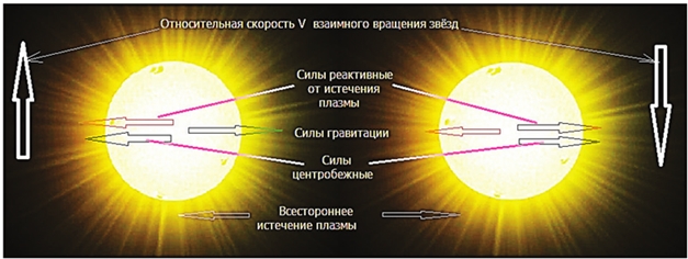 Сторонники Большого взрыва не обратили внимания на космические реликтовые и другие электромагнитные излучения, которые обладают огромной энергией. Взглянем на ту работу, которая совершается этими излучениями. Как известно, гравитационно-связанные звёзды уравновешиваются центробежными силами при их относительном вращении около общего центра тяжести. Кроме того, все горячие космические тела истекают плазмой, тем самым создают всесторонний космический ветер, от которого возникают реактивные силы отталкивания звёзд друг от друга, как бы далеко они ни находились (рис. 2).