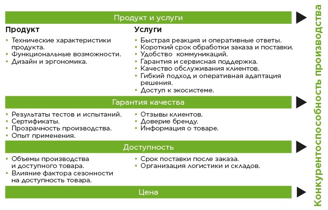 Конкурентоспособность определяется комплексом показателей – собственно продукт и услуги, способы гарантии их качества, их доступность и цена, – на которые влияют уровень и возможности производства. Важно помнить, что все это непосредственно зависит от горизонта планирования бизнеса, – и чем сложнее продукт, тем дальше этот горизонт.