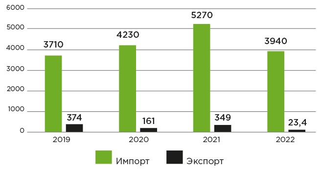 На рисунке 2.3 показан объем российского экспорта и импорта компьютерной техники за 2019–2022 гг., согласно международной базе данных (показательный пример высокотехнологичной продуктовой категории). К счастью, удалось найти данные, в которых по единой методике посчитан и импорт, и экспорт, что позволяет оценить именно соотношение показателей. При этом соотношение экспорта и импорта, по представленным данным, составляет примерно от 1:10 до 1:15 в пользу импорта[21]21