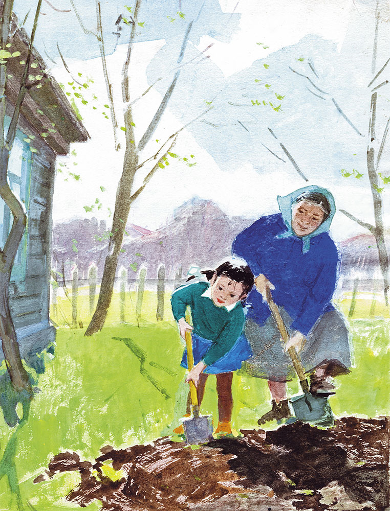 Бабушка помогла. Повыдергали они лопухи да репейники, и принялась Танюша землю вскапывать. Нелёгкая это работа. Сперва надо дёрн снять, потом комья разбить. А дёрн у земли толстый да жёсткий. И комья твёрдые.