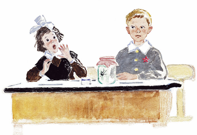 Однажды Андрюша принёс в стеклянной банке большого паука. Увидев страшилище, Ася побледнела и тут же перебежала на другую парту.