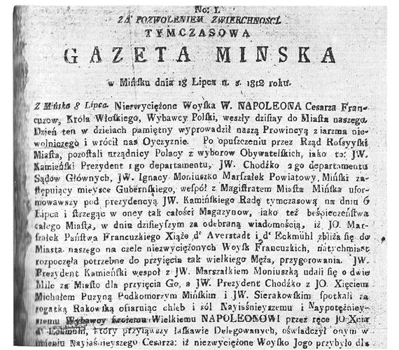 Полюбопытствуем, что нам сообщала «Минская газета» 18 июля 1812 года (подчеркиваю: Минск – это значительный город, а ныне – столица Республики Беларусь): «Непобедимые войска Великого Наполеона, Императора Французов, Короля Итальянского, Избавителя Польши, вступили сегодня в наш город. Этот памятный в истории день освободил нашу провинцию от ига рабства и возвратил нас Отечеству».[818]818