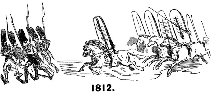 Рисунок из книги Поля Гюстава Доре (1832–1883) «Живописная, драматическая и карикатурная история Святой Руси на основании текстов хроникеров и историков Нестора, Сильвестра, Карамзина, Сегюра и т. д. в 500 рисунках с комментариями» (Париж, 1854) – в частном собрании Е. Понасенкова. Французские солдаты уходят от русского климата.