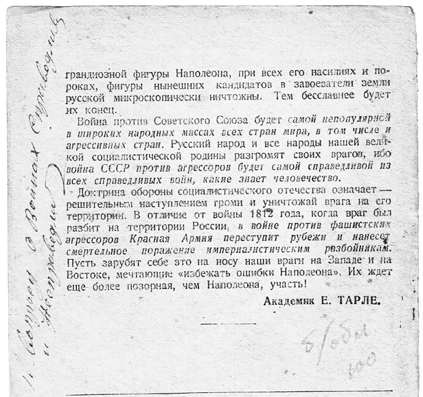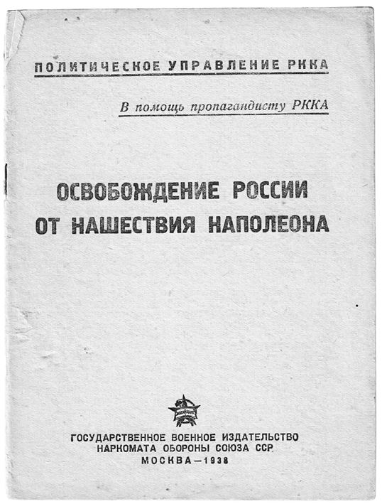 Казалось бы: до войны Германии с СССР еще три года, Тарле еще не начал свою откровенно пропагандистскую деятельность (в период 1941–1945 гг. он стал автором многочисленных не научных, а примитивно пропагандистских статей в советской периодике, также произносил соответствующие публичные речи). 1938 год: вроде бы мир и покой; судя по всем документам, Гитлер еще около двух лет не имел оперативных соображений о войне с СССР. Юбилей 1812 года прошел год назад, да и сам технический уровень современной войны поменялся – и события далекого прошлого уже не так интересны кадровым военным. Значит, задача текста была вовсе не профессионального свойства: в финале статьи (последняя страница брошюры, 16-я) содержалось четкое объяснение конкретного политического намерения. Вот оно (курсив – как в подлиннике):