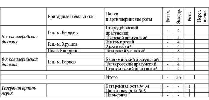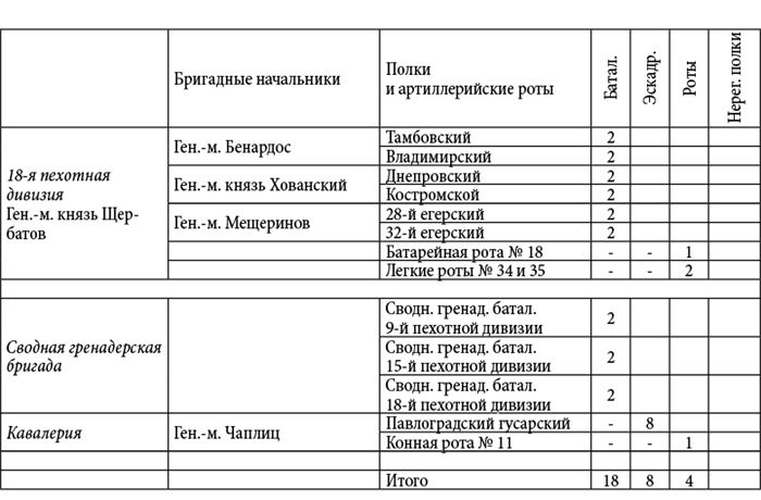 В Главной армии, за исключением казачьих полков, состояло под ружьем около 20 000 человек и 220 орудий, считая вместе с резервной артиллерией.